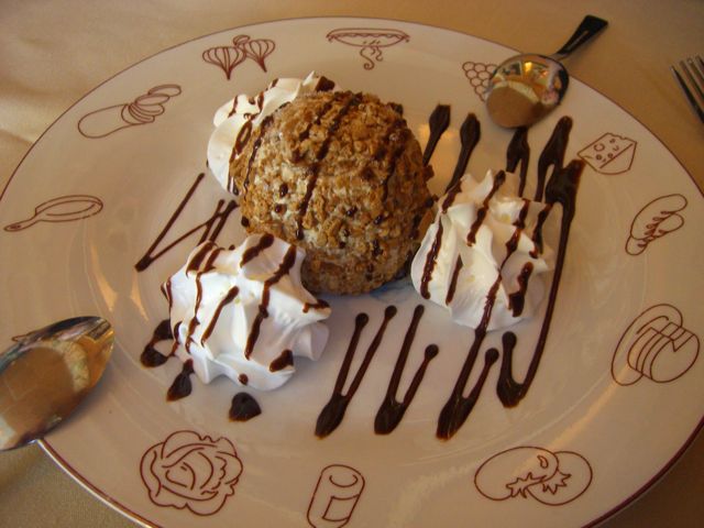 Last but not least, we finished the meal with a complimentary shot of chocolate liquor (homemade by the man, himself) and a crispy cappuccino ice cream.  The outside of the ice cream almost tasted like the cinnamon coating on a crumb donut and went very well with the coffee flavored center.
