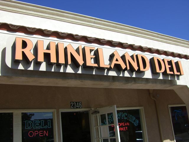 Sometimes the best gifts come in ugly wrapping. I’ve personally never gotten a cool gift in anything other than cool wrapping, but now that I’ve had Rhineland Deli, I at least know what those poor suckers mean. This place is in a rundown little shopping center right next to The Lakes, Thousand Oaks’ newer, slightly snootier, shopping experience. It’s right by a donut shop and a mexican restaurant but if you aren’t looking for it, you’re sure to miss it. Anyway, here is what the sign looks like. Maybe that will help.