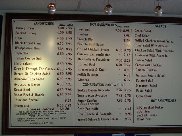 The prices may seem high when compared to your Subways and Quiznos. But you have to understand that those places serve low quality meat and processed cheese. All the ingredients here are top notch. Also Rhineland sandwiches tend to be a bit more vertical, instead of the four flattened slices of cheap turkey that you get at subway. Their double meat is a quarter of what Rhineland gives you for just a couple bucks more.