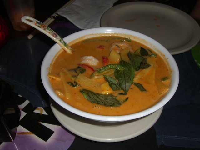 We shared three dishes for dinner. I got the red curry with shrimp, Jackie got the veggie pad thai and Alisa ordered chicken fried rice. I honestly don’t know how long it took for the food to come out because we were having a pretty good time, but it didn’t seem to take very long at all.